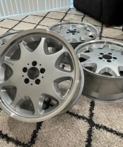 This set of authentic 19″ BRABUS Monoblock III wheels measures 9.5 inches in width and was manufactured in Germany for Mercedes-Benz flagship models, most notably the W140 S-Class and C140 CL-Class. Each wheel has been professionally refinished and features silver painted faces paired with polished lips. BRABUS casting marks appear on the back of each wheel along with sizing, offsets, and manufacturing details.