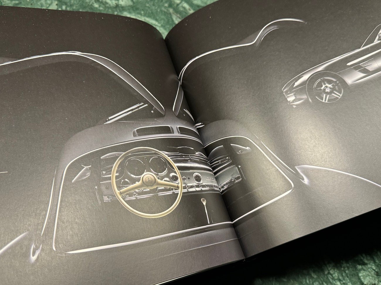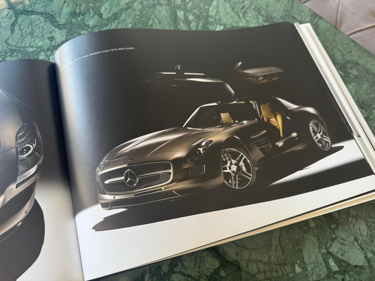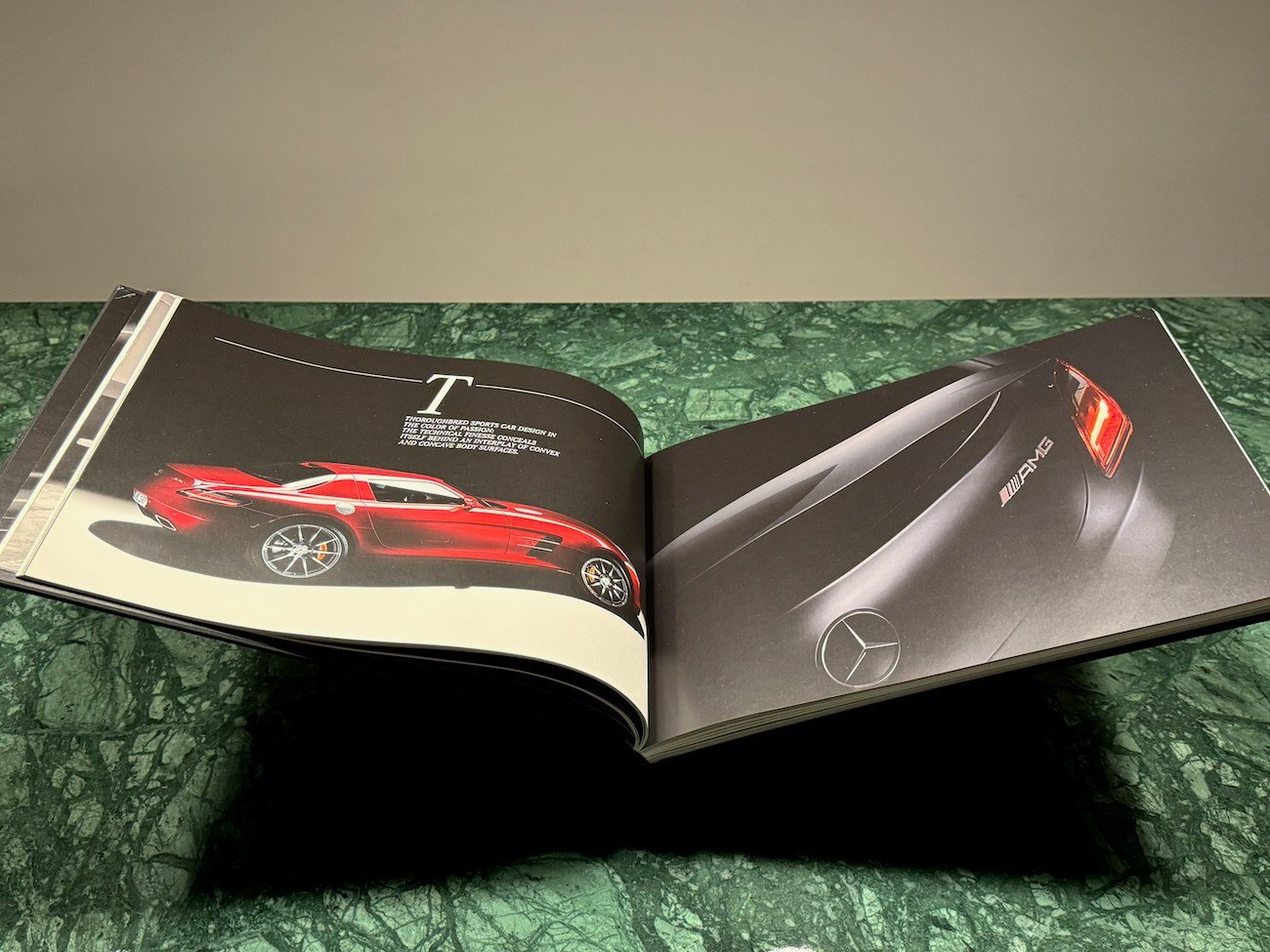 The book includes its original matching slipcase, both of which are preserved in excellent condition with clean surfaces, tight binding, and fully intact pages. The presentation book spans 144 pages, featuring detailed photography, engineering background, design philosophy, and official Mercedes-Benz documentation as given to first-owner SLS AMG buyers.