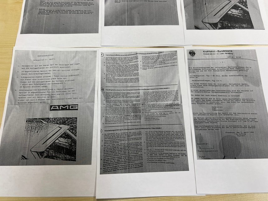 Offered here is an authentic premerger AMG rear spoiler for the S123 wagon. This is a New-Old-Stock, unrestored, and never-mounted example—an increasingly rare find for period-correct AMG restorations. The spoiler remains in its original unfinished/unpainted state and comes with photocopies of the original AMG documentation and installation instructions.