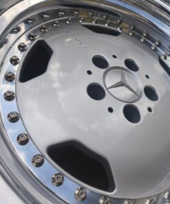 Set of 4 staggered 3-piece 17″ AMG Aero III wheels professionally refinished and made in Germany by O.Z. Racing for Mercedes-Benz AMG vehicles. Originally 8.5″ wide on all four faces, the rear wheels have been fitted with 3″ lips to achieve 10″ width. Original 1.5″ lips are included, allowing the rear wheels to be reverted to factory 8.5″ width. Faces are finished in silver with polished lips, exposed OZ hardware, and barrels. Paint-matched Mercedes-Benz center caps are included.