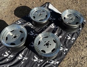 Set of staggered 3-piece 17″ AMG Aero III wheels manufactured by O.Z. Racing in Germany for Mercedes-Benz AMG vehicles. The front wheels measure 8.5″ wide and the rear 10″ wide, featuring silver painted faces with polished lips and exposed bolts. Each wheel bears original casting marks, including “AMG Germany” and “Forged O.Z. Racing” stamps. These wheels have been professionally refinished with new hardware, while the original OZ bolts are included if desired.