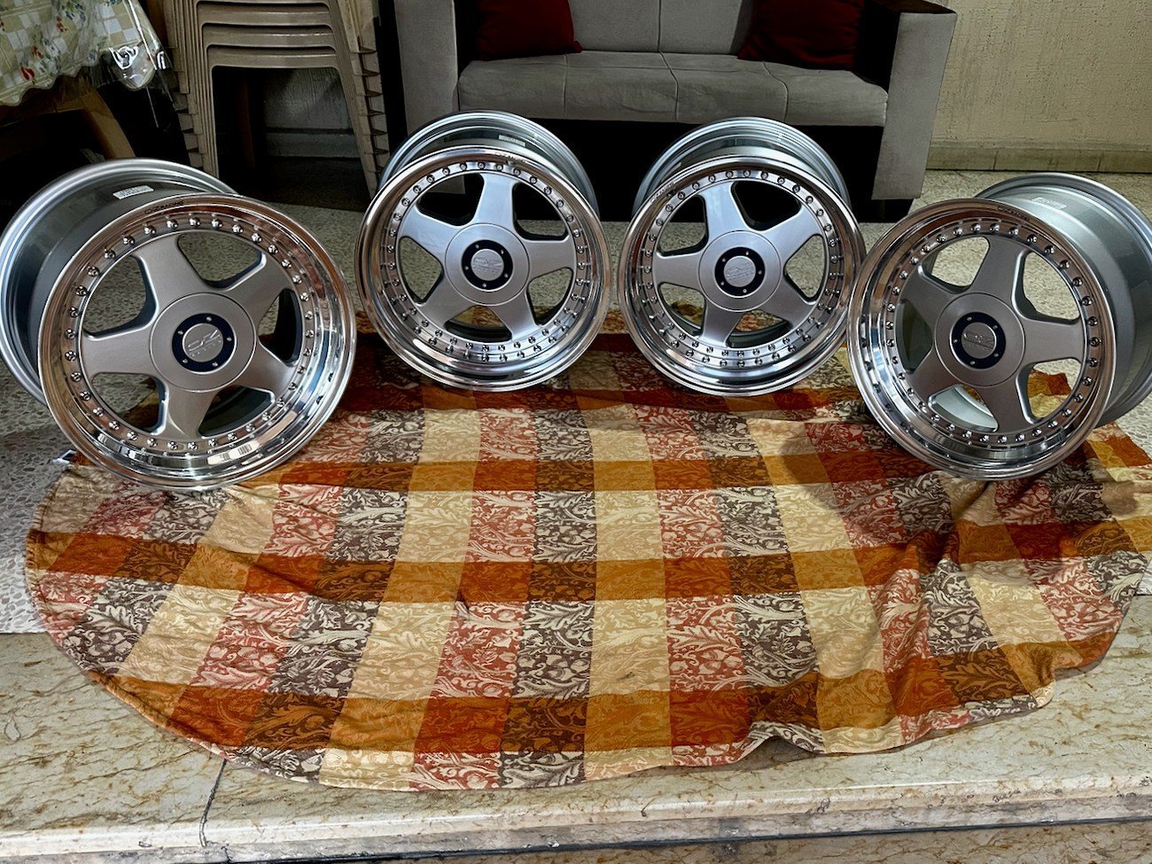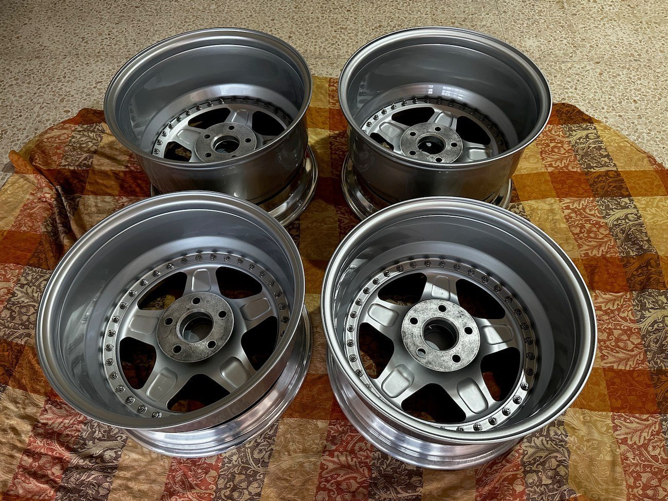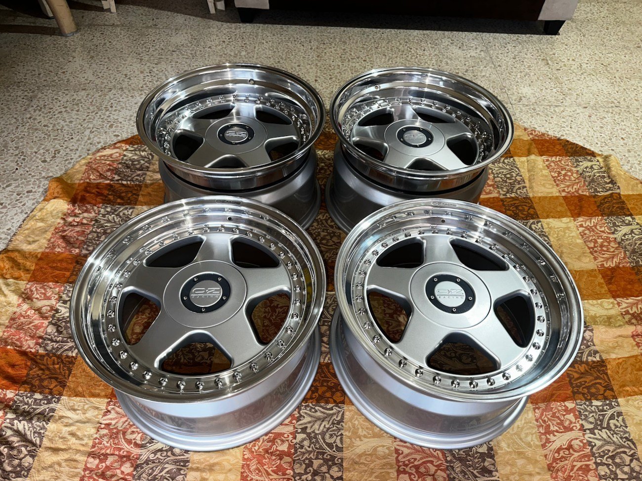 Authentic OZ Racing Futura 3-piece wheels from Italy, professionally refinished and in excellent condition. This staggered set was designed for Mercedes-Benz vehicles and includes front 8.5″ and rear 9.5″ widths, polished lips, and silver painted faces with exposed OZ Racing hardware. Four original OZ Racing center caps are included.