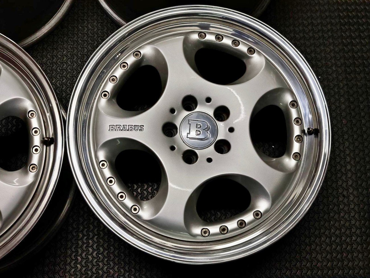 Professionally refinished staggered 3-piece 18″ BRABUS Monoblock IV wheels, perfect for Mercedes-Benz enthusiasts seeking classic German engineering and refined styling. These wheels combine a clean silver painted face with polished lips and exposed bolts, showcasing the iconic BRABUS design.