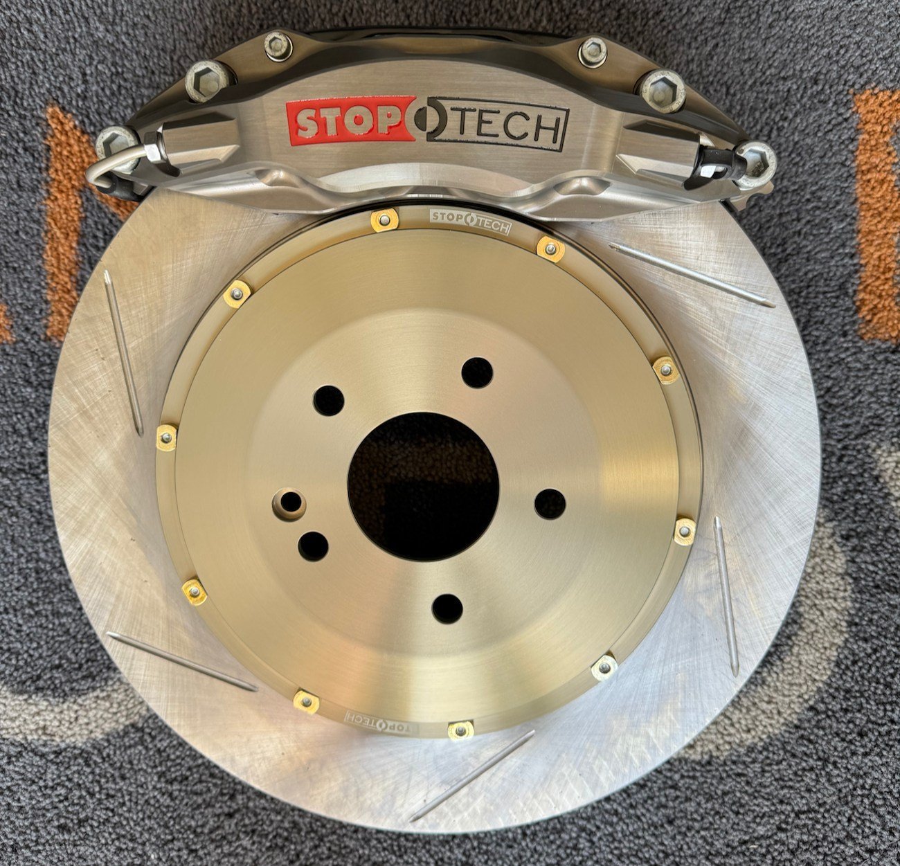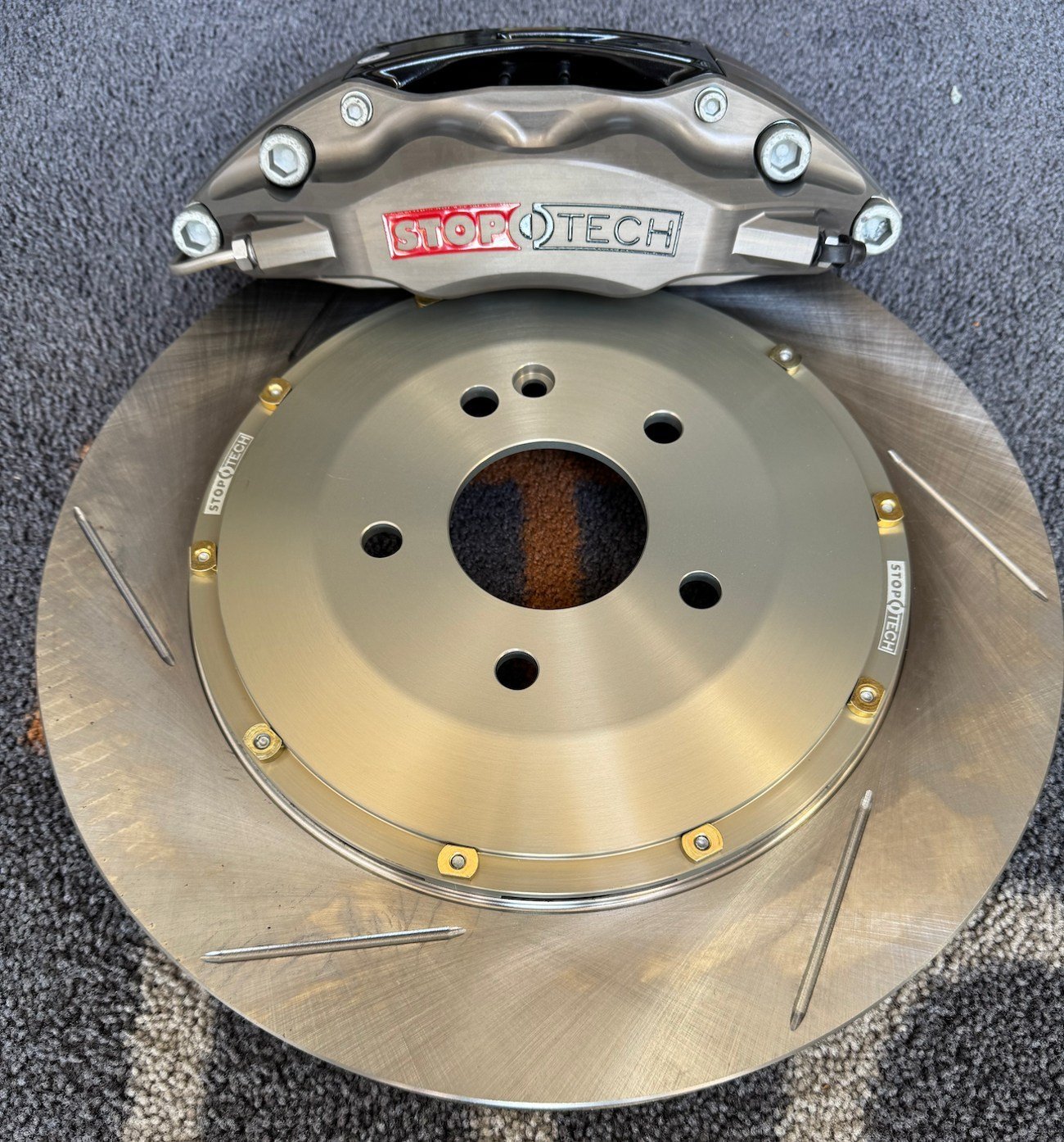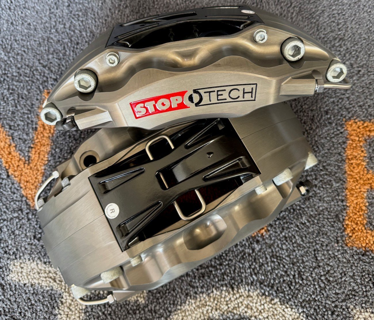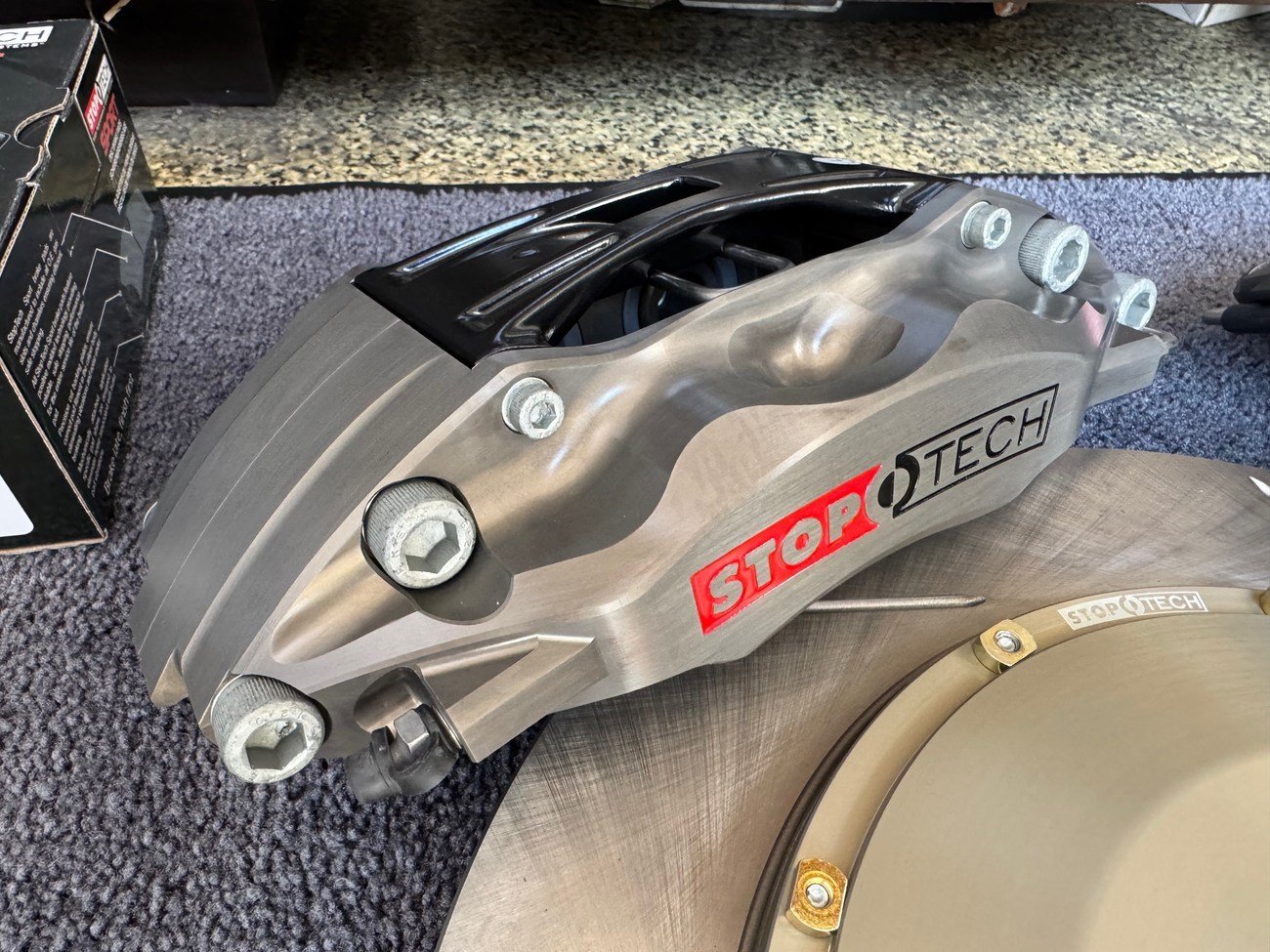 Calipers: Fully forged two-piece opposed piston calipers, anodized silver with StopTech branding, 4 pistons per caliper