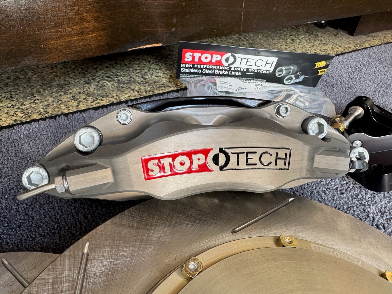 Calipers, rotors, pads, lines, and mounting hardware included
