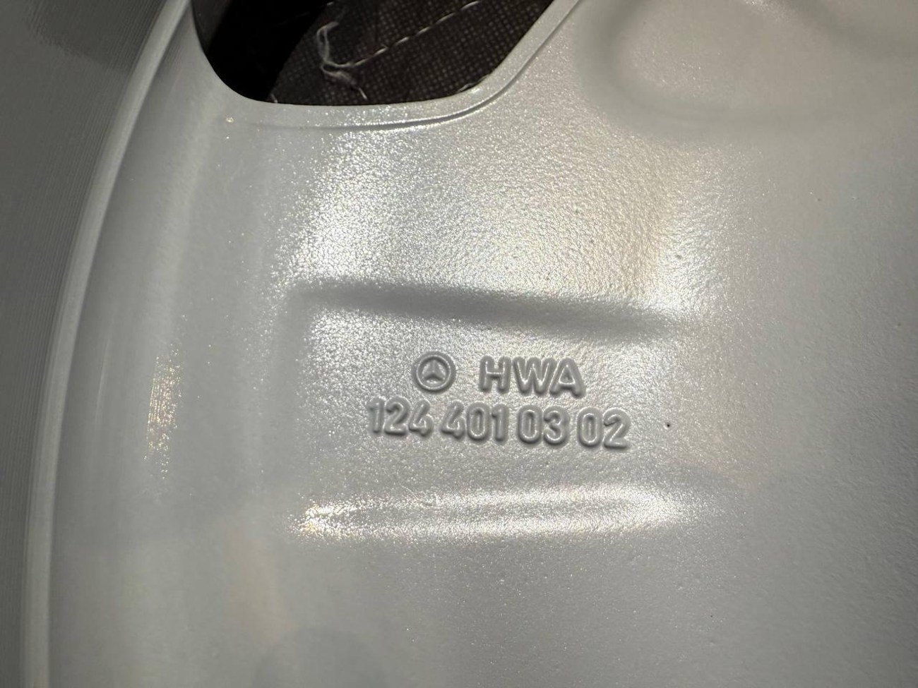 Set of 4 genuine 17″ Aero II AMG Monoblock wheels designed for Mercedes-Benz W124 models, including sedan, wagon, coupe, and cabriolet. Professionally refinished with silver-painted faces and machined lips, these classic AMG wheels feature authentic HWA124 part numbers stamped on the back along with dimensions, offsets, and other factory markings.